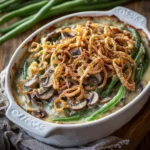 A classic holiday dish featuring tender green beans in a creamy mushroom sauce, topped with crispy fried onions.